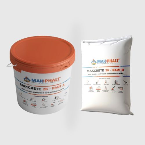 MAK Crete 2K is a pre – packed two component polymer modified cementitious coating, which can be easily mixed on site to form a smooth slurry then applied with brush or roller. This coating cures to form elastomeric waterproofing membrane with excellent adhesion to cementitious surfaces. This should be applied onto damp substrates, internal and external wet areas. The cured membrane is flexible, durable, weather-resistant to most substrates.